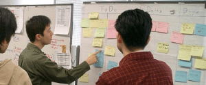 In this area, “Index Cards” and “Post-It” sticky notes have long been and still are the most popular tools. They can be treated by hand and arranged spatially, and they boost conversation and collaboration of the planning meeting. We all love them!