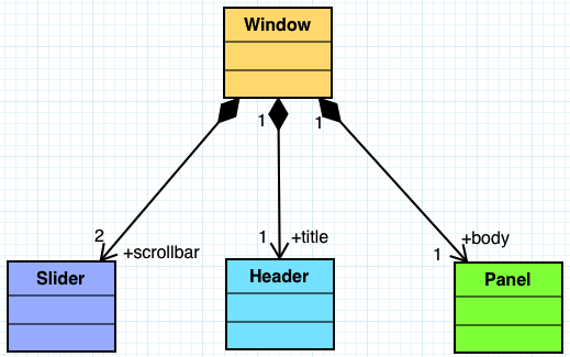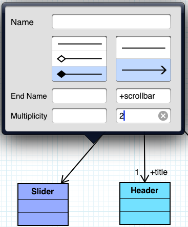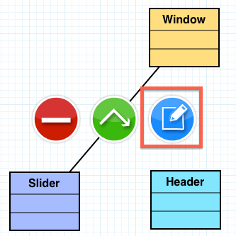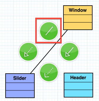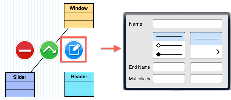 1. Create four classes first, then create one association from [Window] to [Slider]. Tap the [Window] class so that 4 icons appear. Tap the green icon and then drag it to the [Slider] class to create an association.