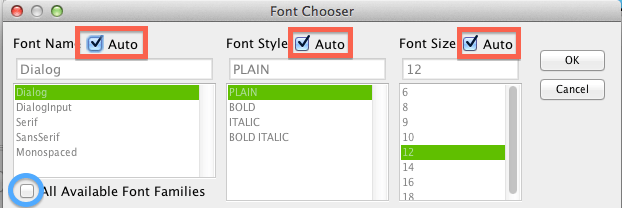 When the Font chooser box first opens, all of the top check boxes are ticked with the default setting. Uncheck them in order to choose your preferred font style. Also checking [All Available Font Families] box will show all the font styles that you can select.