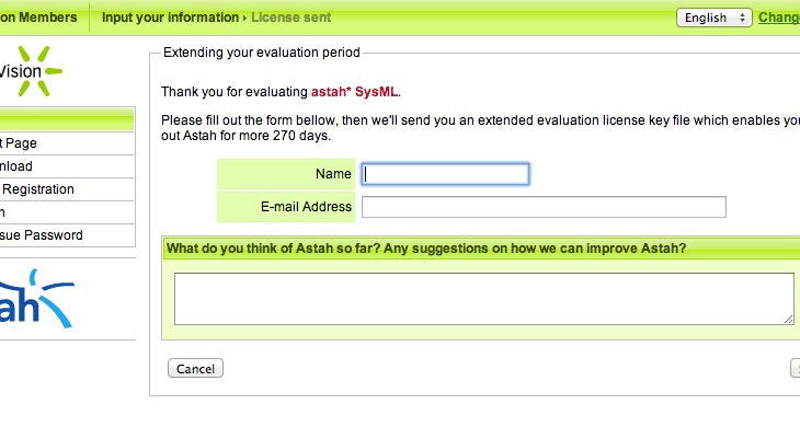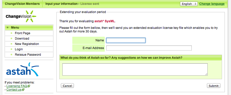 4. You will be taken to this page below on your web broswer. Fill out your name, email address and a comment for us or Astah to get 30-day extension on your trial.