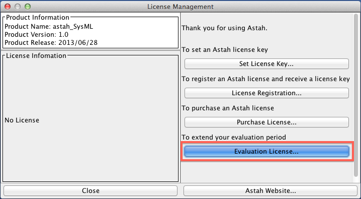 3. After your 20 day trial, an alert appears and ask you to set the purchased license or apply for an evaluation license. So click [Evaluation License] button.