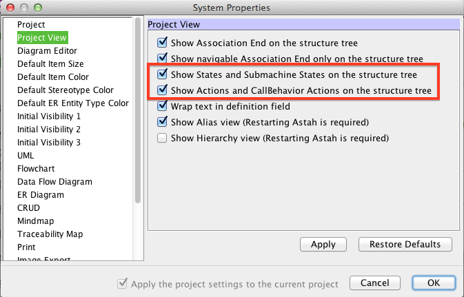 (2) Check the option [Show States and Submachine States on the structure tree] or [Show Actions and CallBehavior Actions] on the structure tree] and then click [Apply] – [OK].