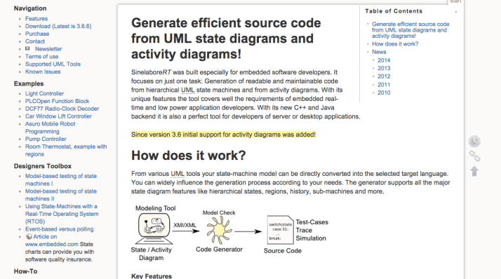 “SinelaboreRT” is a source code generator designed for embedded software developers that generates readable and maintainable code from UML statemachine diagrams and Activity diagrams. It can of course generate code from Astah.