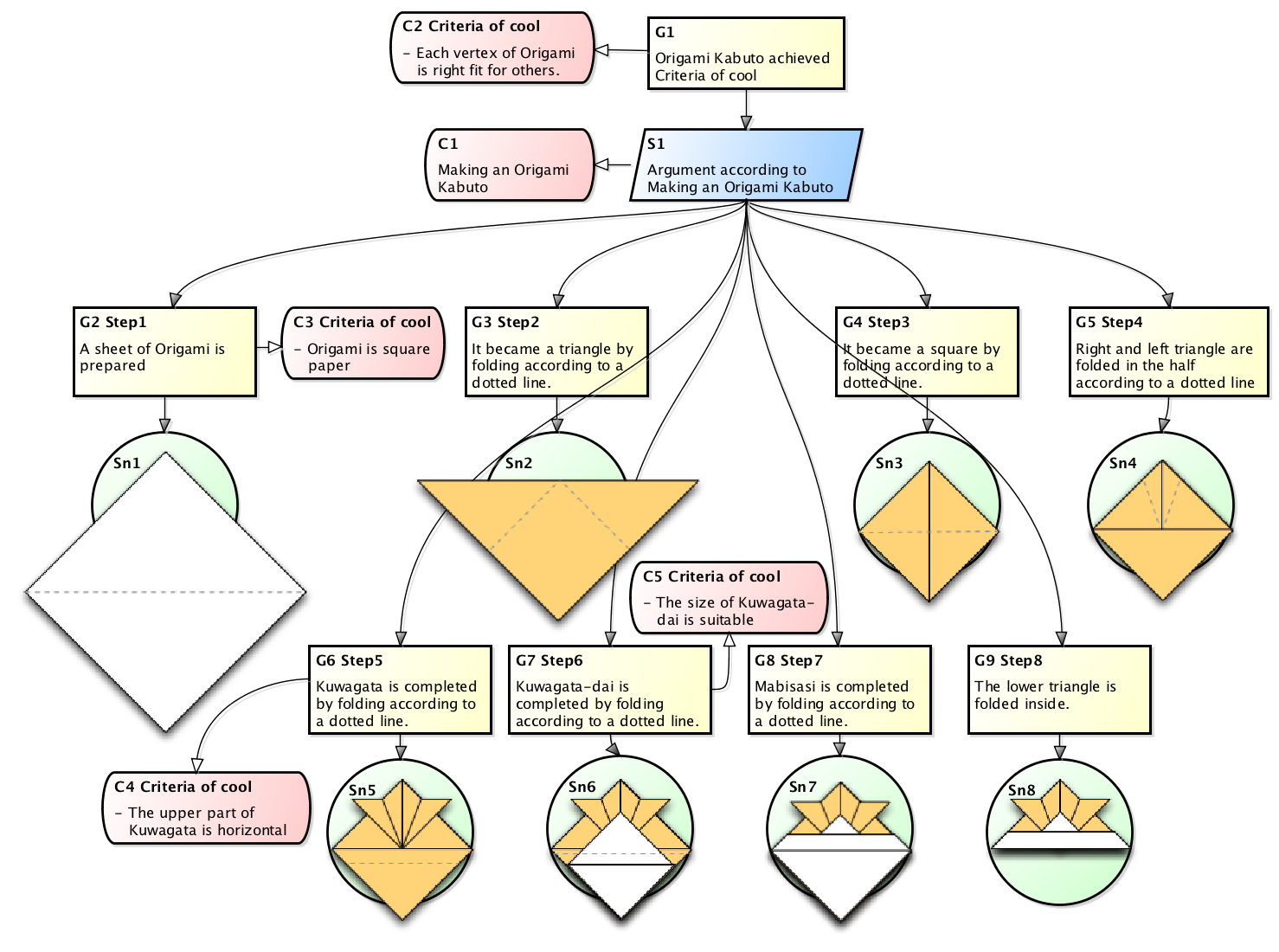 So below is the diagram he drew that shows the process of how to fold beautiful Kabuto which is a Japanese warrior helmet (see the right image) with Origami papers and secret know-hows (implicit knowledge) extracted by using “Context” node in GSN (Goal Structuring Notation).