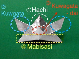 Origami Kabuto inherits three characteristics, vertex, side and face, and it consists of 4 parts called ‘Hachi’ (the main part of its hat), ‘Kuwagata’ (a hoe-shaped helmet crest), ‘Kuwagata-dai’ (A crest stand), and ‘Mabisasi’ (a visor). In the Figure.2, dotted arrow represents the relation of two parts that how one is folded will affect the size of the other part. (e.g. If Mabisasi becomes bigger, the size of Kuwagata-dai will get smaller and may look unbalanced together). I believe the model in Figure.2 is easy to understand because it shows the nature of the structure of Origami.
