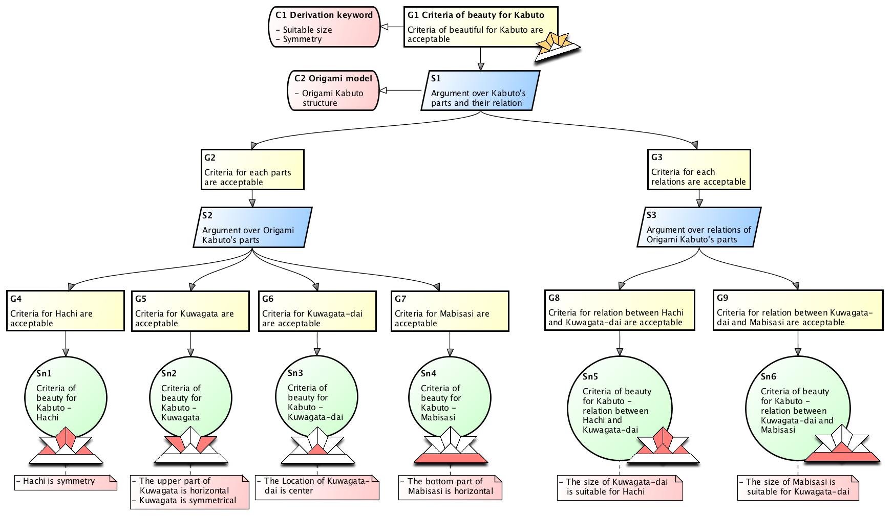 - The top goal is “Criteria of beauty for Kabuto is accepted’, claimed using yellow ■ Goal node (G1) on the top.