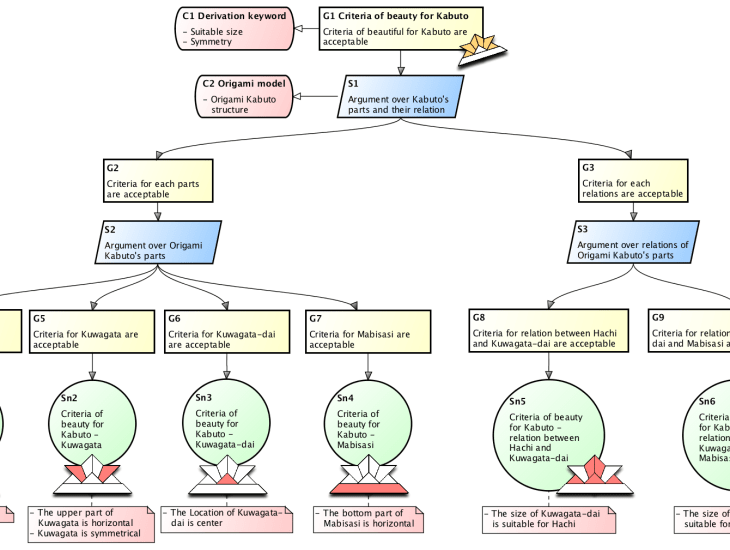 - ‘Suitable size’ and ‘Symmetry’ are adopted as key points shown in pink ■ Context (C1) to derive the criteria of ‘Beautiful Kabuto’. This is placed on the top as this is the core guideline to achieve the top goal and applies to the whole nodes in this diagram.