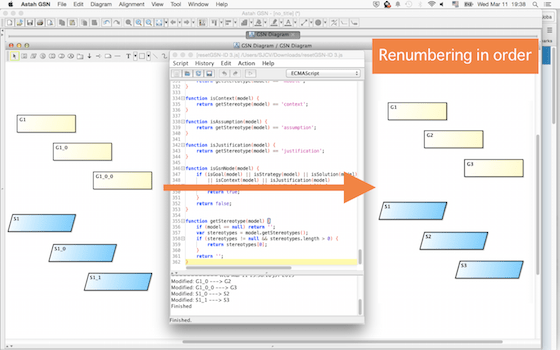 (6) When it completes, it shows the “Finished!” and a result of how Astah changes the ID in the bottom pane and the numbers are updated at the same time on GSN.