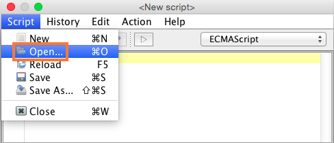(4) A [Script] window opens. Select [Script] – [Open], and select the .js file you downloaded at step (2) .