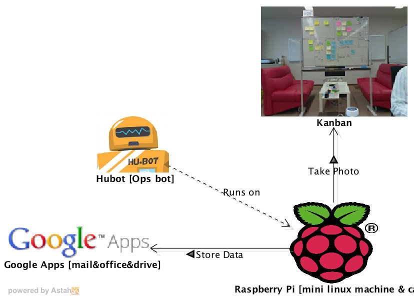 The Hubot runs on Raspberry Pi. RasPi takes a shot of Kanban board at 10:00 every morning and uploads the photo onto Google Apps automatically.