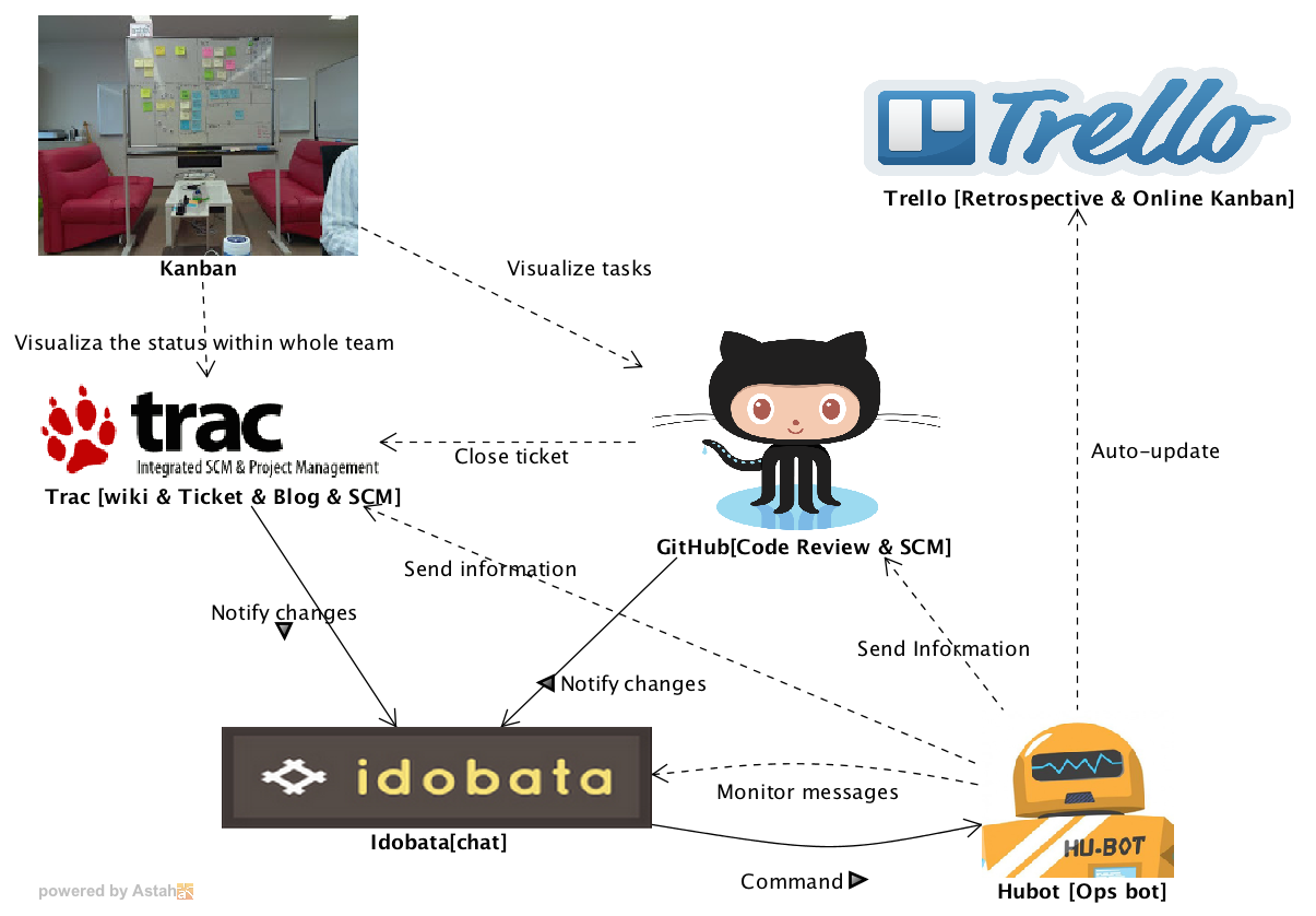 Any changes from GitHub and Trac are notified on Idobata on real-time and Hobot monitors every change on Idobata and then automatically makes updates on Trell accordingly.