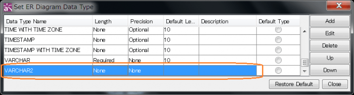 If you cannot find the one you want, you can always add from [ER Data Type] menu. Here is an example of adding one – [VARCHAR2].