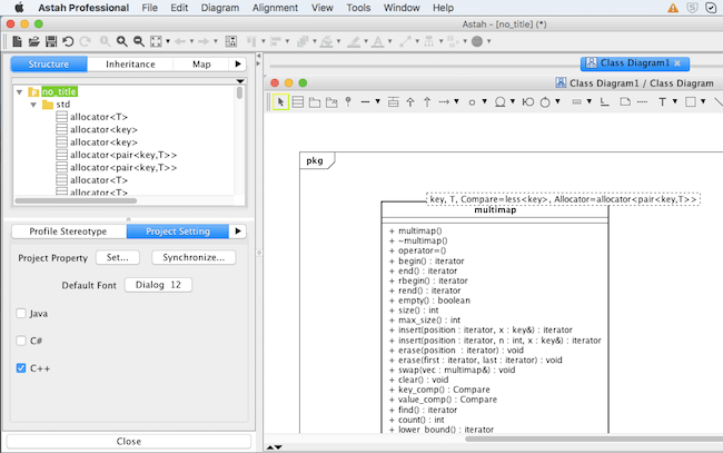 By installing this plug-in, you can import C++ source code into Astah and also source code generation is supported by default.