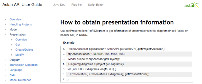 If you want to start experimenting, stat with Script Editor, which enables you to access Astah models with API with scripting language. (If you are using the latest version of Astah Professional, this is pre-installed. Otherwise, install.)