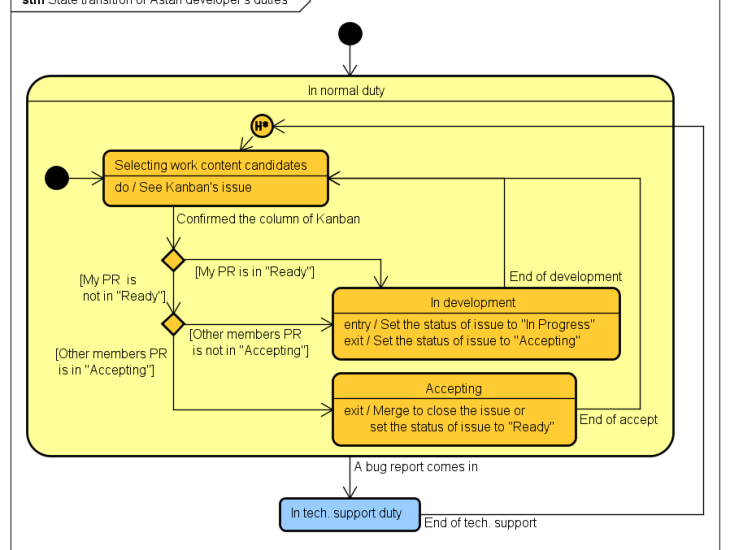Today I’d like to show a little bit about Astah developer’s job. This is a Statemachine diagram I created about our job.