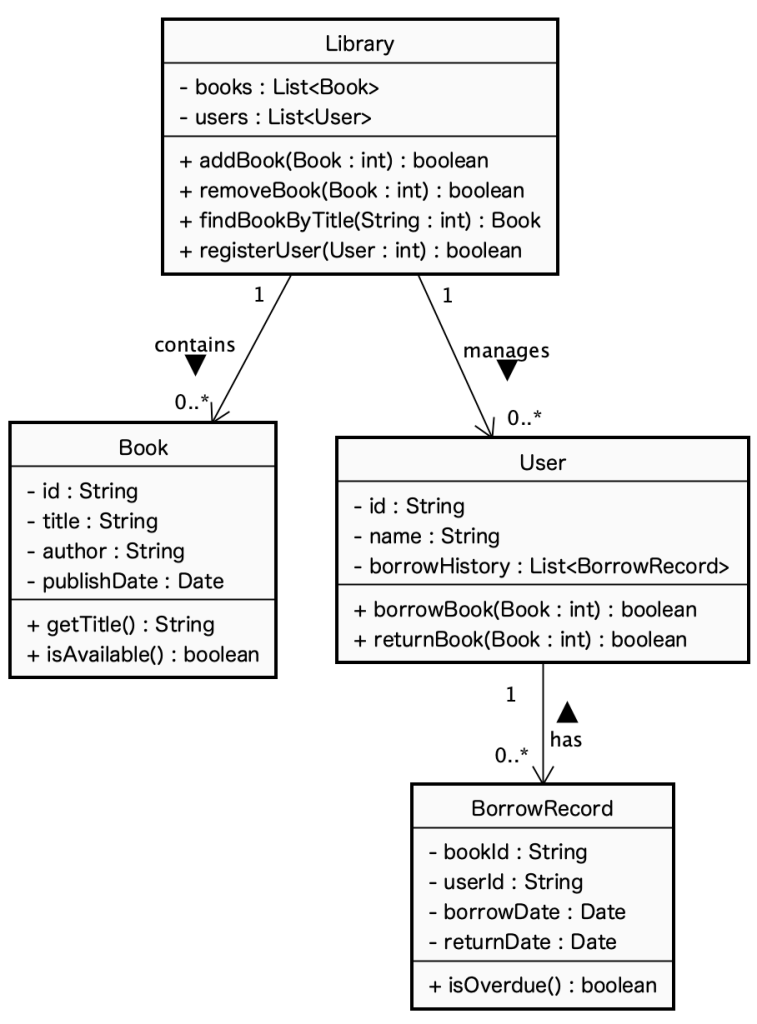 We analyzed a simple book management system class diagram using Claude 4 Sonnet. Below is a summary of its insights and suggestions. The output was lightly edited for readability.