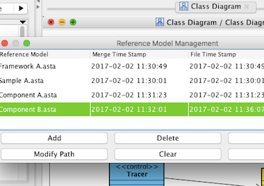 Astah’s “Reference Model Management” is a very powerful function which allows you to import other project models as read-only. So you can work on your models using other project models without worrying about altering them. When there’re any updates on the original models, Astah automatically detects it and informs you, so that you won’t miss to sync and can work with the latest models all the time.